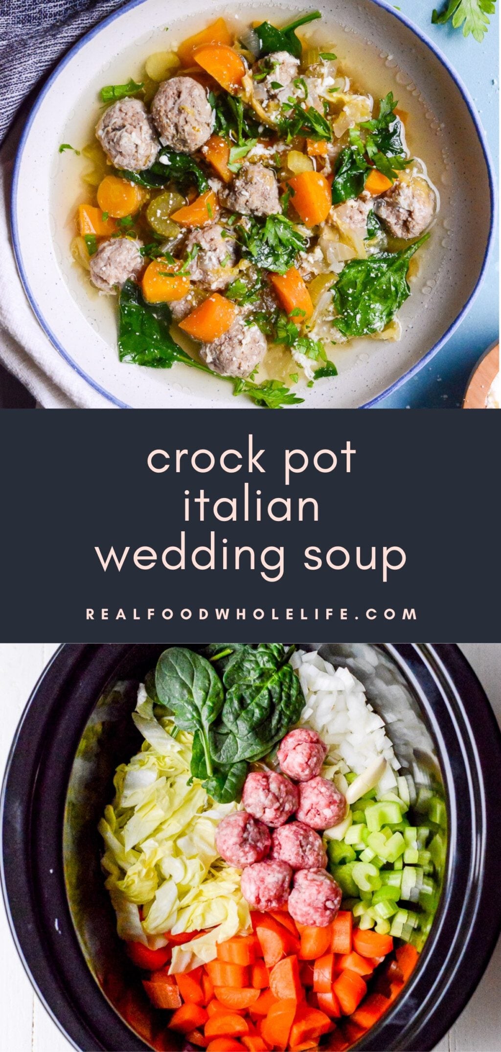 The inspiration for this recipe was to make a slow cooker version of Giada De Laurentiis Italian Wedding Soup and Ina Garten’s Italian Wedding Soup.