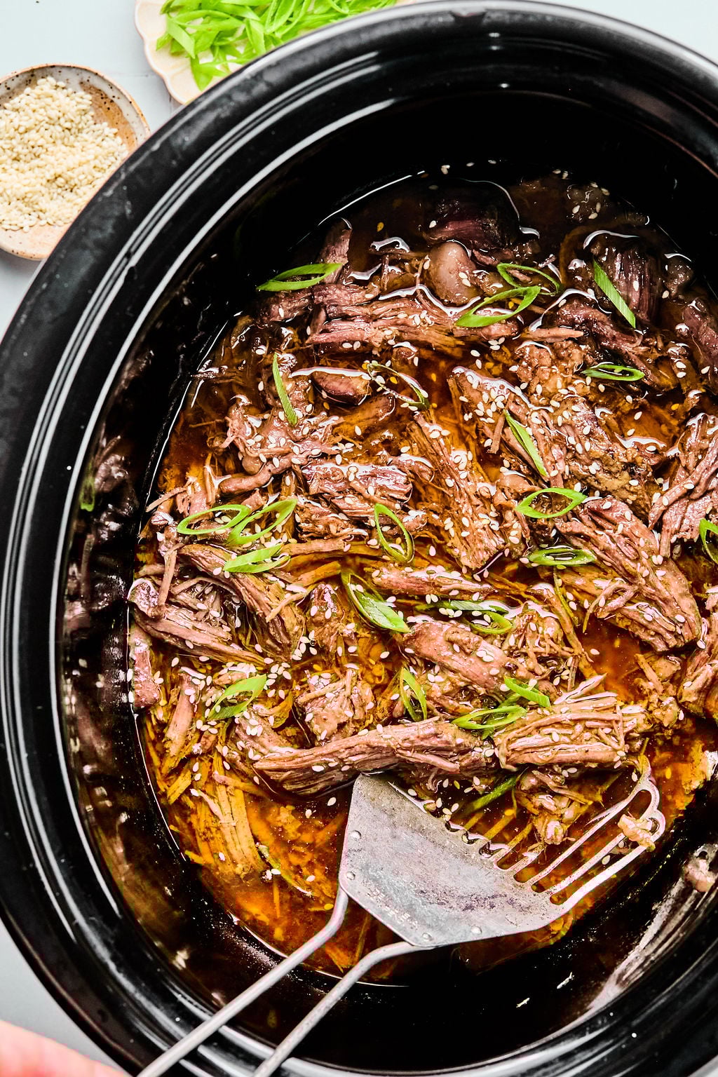 The sauce is bringing that savory Korean-inspired mix of soy, brown sugar, ginger, garlic, and sesame, and the longer cook turns the beef into the kind of fall-apart tender situation that makes everyone wander into the kitchen asking what’s for dinner.