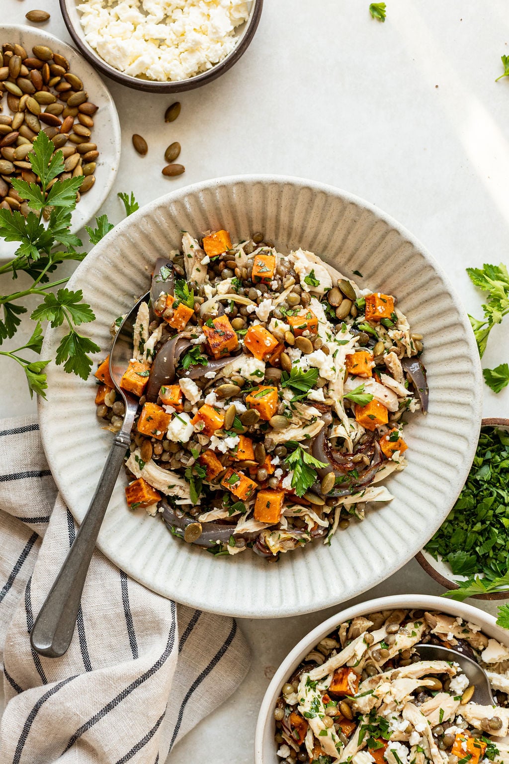 - Assemble The Salad: To the large bowl, combine the cooked lentils, shredded chicken, roasted sweet potato and onion, feta and parsley, tossing gently to combine. If you have time, allow to sit for 10-20 minutes, for the lentils and chicken to better absorb the dressing.